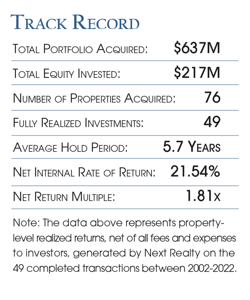 Next Realty’s high standard of success: Since our inception in 1998, Next Realty has evaluated hundreds, even thousands of opportunities to select and complete over 75 transactions across multiple asset types and locations, representing nearly $650 million in gross asset value nationwide.